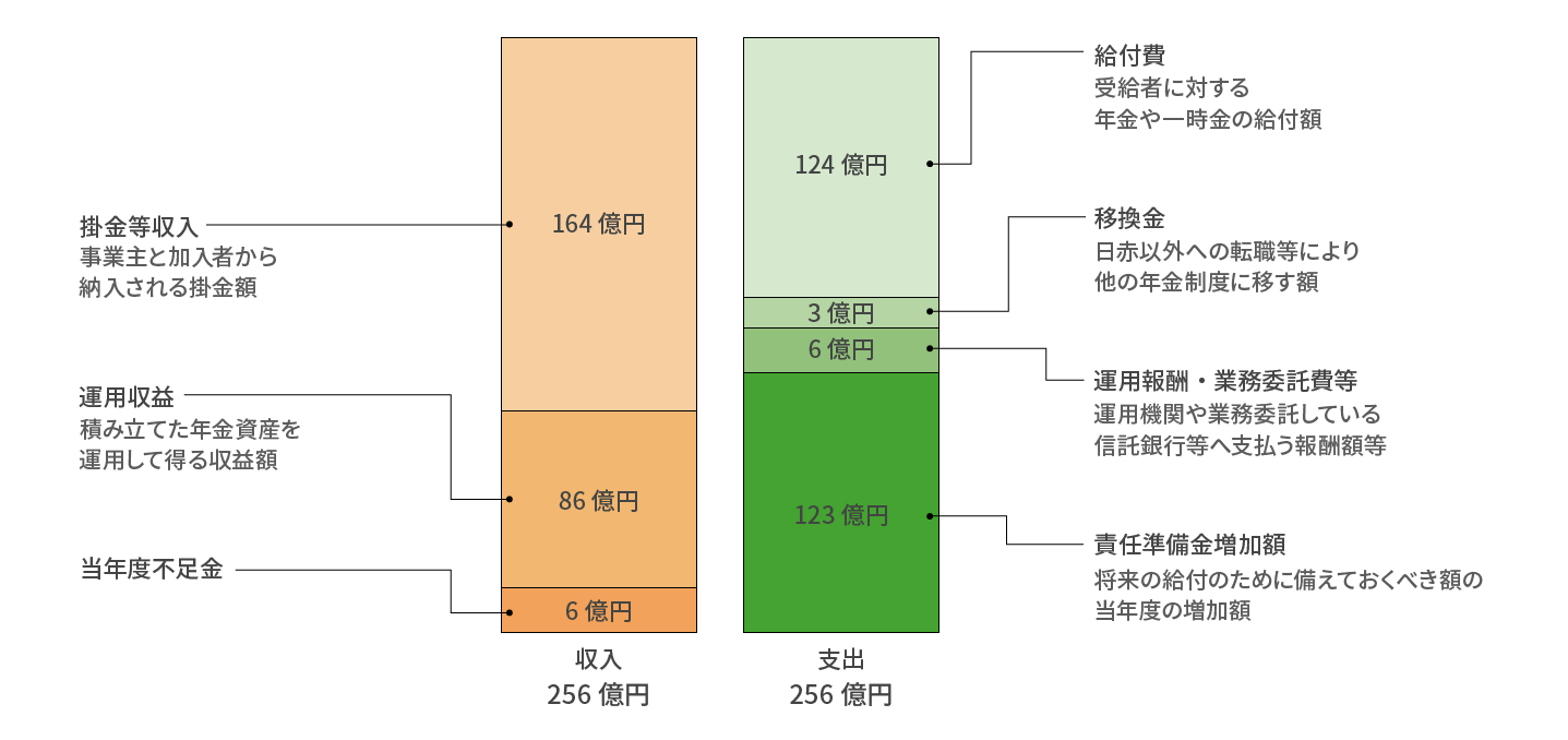 - 年金給付、掛金収入、資産管理や運用などに関する経理です。